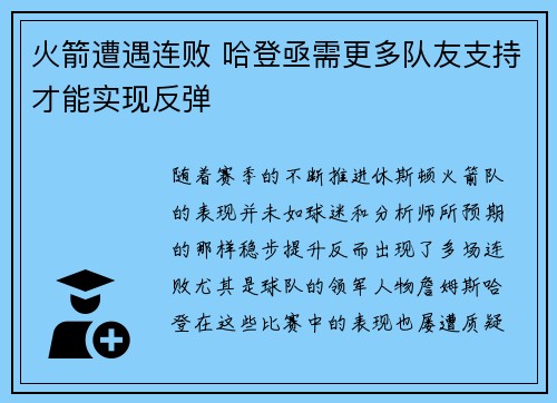 随着赛季的不断推进,休斯顿火箭队的表现并未如球迷和分析师所预期的那样稳步提升,反而出现了多场连败,尤其是球队的领军人物詹姆斯·哈登在这些比赛中的表现也屡遭质疑。火箭队遭遇连败的根本原因不单单是哈登个人...