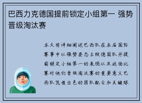 本文将详细阐述巴西队在本届国际赛事中以强势姿态击败德国队,并提前锁定小组第一的表现,以及这场比赛对他们晋级淘汰赛的重要意义。巴西队凭借出色的团队配合和关键球员的出色发挥,不仅在与德国的关键对决中取得了...